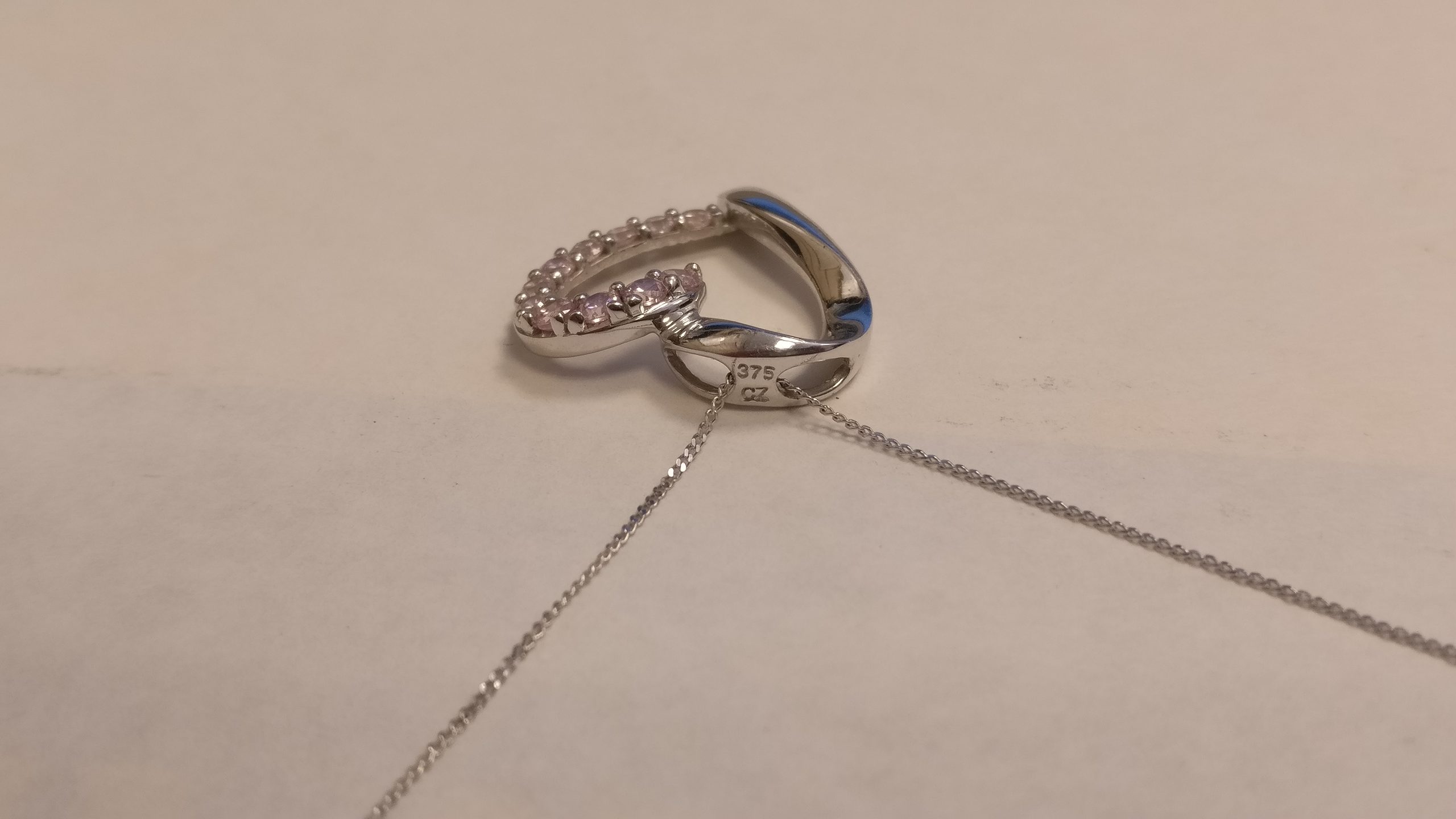 9ct White Gold fine curb chain with heart pendent with CZ stones